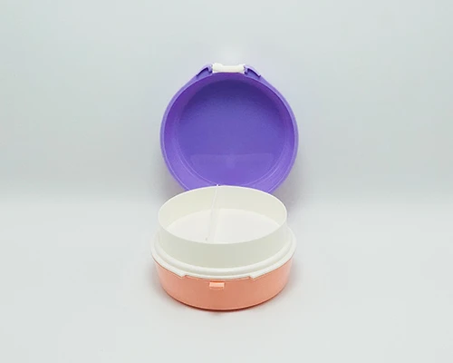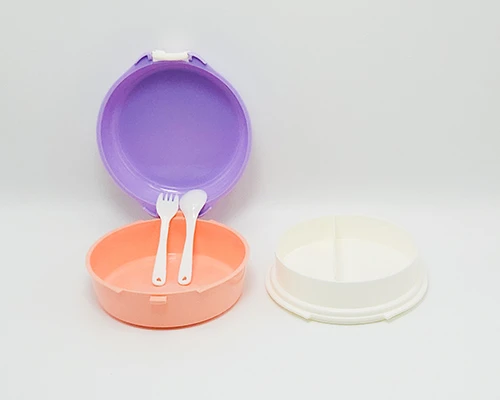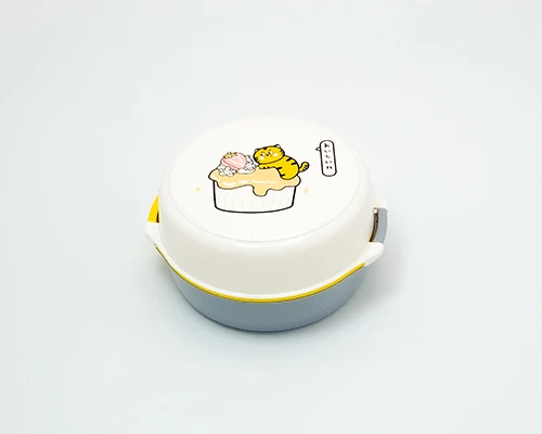 علبة طعام بلاستيكية بتصميم عملي وأنيق، تتكون من قاعدة وغطاء بلمسة مرحة. من الداخل تحتوي على حاوية دائرية قابلة للإزالة مع فاصل لتقسيم الوجبة إلى جزئين، مما يساعد على فصل الأطعمة بسهولة.